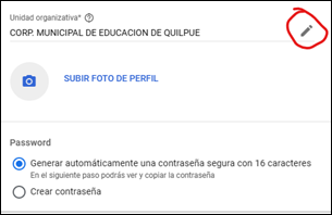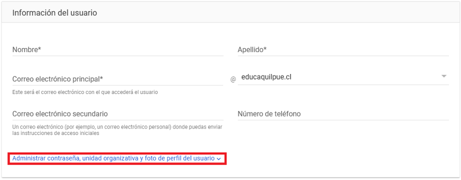 1.- Al crear un usuario, debes hacer click en “Administrar contraseña, unidad organizativa y foto de perfil del usuario”: